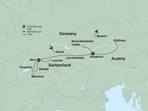 Journey through spectacular mountain scenery and picturesque cities as you experience three Alpine countries. Spend four nights each in the UNESCO World Heritage city of Bern and the charming Alpine city of Innsbruck. Ride the legendary GoldenPass Panoramic Train from Montreux to the Alpine ski resort of Gstaad. Explore Lucerne, the "Swiss Paradise on the Lake.” Visit Mozart’s birthplace and the Mirabell Gardens, featured in the “Sound of Music,” during your time in Salzburg. Tour the fairy-tale castle, Neuschwanstein. Sample traditional regional cuisine, including cheese fondue, at some of the oldest and most famous restaurants in Europe. The hills are alive on this enchanting journey across Switzerland, Austria and Bavaria.