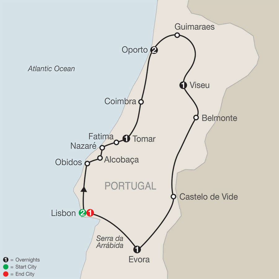 LISBONWelcome dinner; guided sightseeing, visit the Alfama quarter and Jeronimos Monastery; farewell dinner OBIDOSWalking tour of the medieval townALCOBAÇAVisit the Church of Santa Maria MonasteryNAZARÉLunch breakFATIMAVisit the Sanctuary of Our Lady of the RosaryTOMARVisit the Convent of ChristCOIMBRAVisit the University LibraryOPORTOGuided sightseeing, visit the Church of Sao Francisco and the Arabian Hall in the Stock ExchangeGUIMARAESWalk through the medieval centerQUINTA DA AVELEDAEnjoy [LF] Portuguese tapas with wine and explore its splendid gardensVISEUDinner at a local restaurantBELMONTEVisit the Jewish Museum; olive oil tastingCASTELO DE VIDEWalk through the Jewish quarterEVORAVisit a cork factory, guided walking tour, visit the gothic cathedral, the Sao Francisco Church, and the Ossuary Chapel