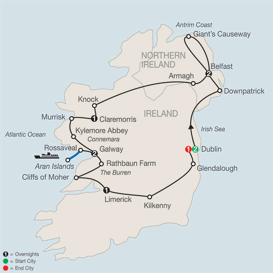 DUBLIN Welcome dinner; orientation drive, visit St. Patrick’s Cathedral DOWNPATRICK Visit the Saint Patrick CentreBELFAST Guided “Living History” tour; visit the Titanic ExhibitionCOUNTY ANTRIM Visit Giant’s Causeway ARMAGH Visit the ecclesiastical metropolis of IrelandKNOCK Visit the Shrine, the Church of the Apparition, the Basilica, the Folk Museum, and attend MassMURRISK (CROAGH PATRICK) Visit the Croagh Patrick Visitor CentreKYLEMORE Visit the Benedictine abbey ARAN ISLANDS Ferry to and from Inishmore; hear a presentation about life on the island by a local historian; take a minibus tour with a driver-guide; visit Dun Aengus; enjoy lunch at a local pub RATHBAUN FARM See the farmer at work and enjoy morning coffee at the farmhouseCLIFFS OF MOHER Savor the spectacular viewsKILKENNY Explore this pretty county townGLENDALOUGH Guided tour of St. Kevin’s center of Irish Christianity