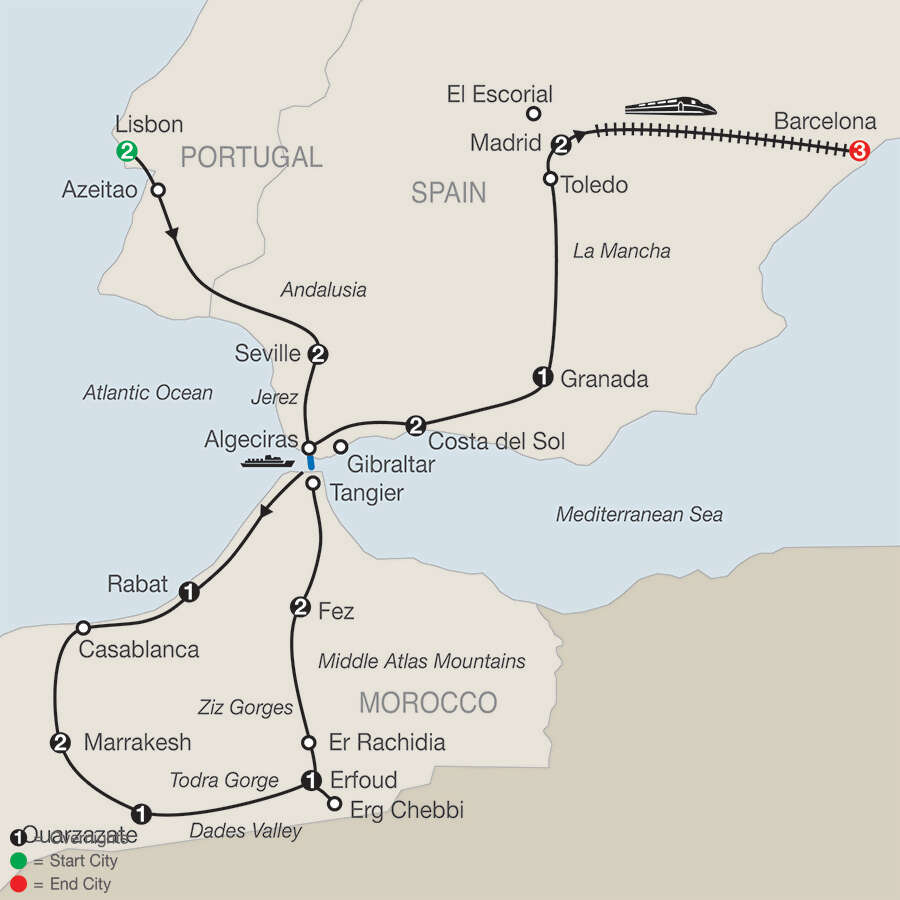 LISBON Welcome dinner; guided sightseeing, visit the Alfama quarter and Jeronimos Monastery AZEITAO Visit a tile workshopSEVILLE Guided sightseeing, visit the Alcazar, and walk through the Santa Cruz quarterALGECIRAS–TANGIER By ferry across the Strait of GibraltarRABAT Guided sightseeing, visit Mohammed V Mausoleum and the Roman relics of ChellahCASABLANCA [LF] Enjoy lunch at Rick’s Café; guided panoramic drive; visit Hassan II MosqueMARRAKESH Guided sightseeing, visit Bahia Palace and the Saadian Tombs (if closed, visit Badia Palace instead)OUARZAZATE Visit Kasbah Taourirt; stay overnight in the area where the movie Lawrence of Arabia was madeERFOUD [LF] Enjoy a four-wheel drive to the sand dune of Erg Chebbi; have traditional mint teaER RACHIDIA Stop in the Ziz GorgesFEZ Guided sightseeing, visit the Medina and Medersa Bou InaniaTANGIER Orientation, board the ferry to SpainCOSTA DEL SOL Stay two nights in the resort of MarbellaGRANADA Guided walking tour, visit the Alhambra complex and the Water Gardens of the Generalife; a special dinner at a local restaurantTOLEDO Guided walking tour, visit an early synagogue, the gothic cathedral, and the Santo Tomé Church with one of El Greco’s masterpieces; visit a Damascene steel workshopMADRID Guided sightseeing, visit the Prado Museum; [LF] farewell paella dinner at a local restaurantMADRID-BARCELONA By high-speed AVE TrainBARCELONA Guided sightseeing including visits to Casa Batllo and the Sagrada Familia BasilicaHeadsets throughout the tour